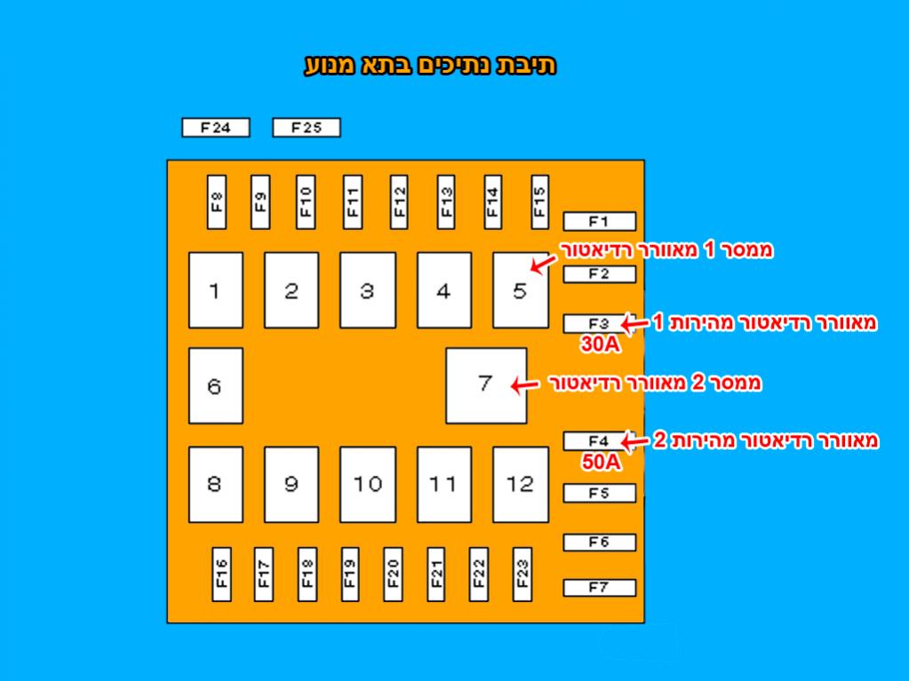 לדעתי, לא כדאי להמשיך לנסוע עם הרכב במצב הזה לפני שמתקנים את הליקויים במע' הקירור. נזק עלול להיגרם למנוע בגלל התחממות יתר. ראש המנוע רגיש מאד לחום וגם עולה לא מעט כסף וחבל, לכן רצוי להקדים תרופה למכה. אין פלא שהרכב מאבד נוזל קירור אם מאוורר הרדיאטור לא עובד והמנוע מתחמם יתר על המידה. המים עוברים את טמפ' הרתיחה וזה גורם לאידוי שלהם ולפריקה דרך הפקק החוצה. האם מלכתחילה היה מספיק נוזל קירור במערכת? חוסר נוזל או אוויר במערכת יכולים לשבש את המדידה של החיישן. גם רדיאטור שבו יש משקעים או סתימה באיזור של החיישן עלול לשבש קריאה. לפעמים לאחר מס' מכות על החיישן בעזרת ידית מברג, החיישן חוזר לפעולה, אך רצוי לרוקן את הנוזל, לבצע לפחות מחזור שטיפה אחד של המע' ובפרט הרדיאטור. שטיפה נעשית ע"י מילוי מים רגילים, הפעלה של המנוע למשך חצי דקה ע"מ שתהיה סירקולציה של המים לשטיפת המשקעים, כיבוי, המתנה של מס' דקות ע"מ שהמנוע יתקרר וריקון המים. למי שמתאפשר אפשר גם לשטוף עם צינור גינה. במצב של מערכת מזוהמת ממש, אפשר להוסיף חומר לניקוי רדיאטורים, אך צריך לקחת בחשבון שזה עלול לפתוח לנו סתימות "טובות" וליצור נזילה. לאחר שהמערכת נקייה, יש למלא בנוזל קירור ייעודי ולנקז אוויר על מנוע דומם וקר. *בזמן הבדיקות, צריך להימנע מגרימת קצר חשמלי (בגלל הזרם הגבוה) ולהיזהר בהתעסקות עם המאוורר (הוא עלול לפעול גם כשהסוויץ' כבוי). ראשית בדוק היטב את הפיוזים F3 (שלושים אמפר) ו- F4 (חמישים אמפר) שבתיבת הפיוזים בתא המנוע, רצוי להוציא אותם, לבדוק ולודא גם תקינות המגעים, לנקות ולהחזיר. עבור על כל החוטים, צמות קונקטורים ומגעים ובדוק שאין נתק, קצר, בידוד או פלסטיק מותך, חיבורים פרוביזורים וכדומה. בדוק את מנוע המאוורר ע"י חיבור מתח ישיר מהמצבר אל שני החוטים האדום (פלוס) והשחור (מינוס) שבמאוורר (בזהירות שלא יהיה קצר ולא להשתמש בחוטים דקים מדי). אם המנוע עובד תמשיך בבדיקות. אם הוא לא עובד וודא שחיברת הכל כראוי. בדוק שהקונקטור של המאוורר נקי מקורוזיה, תקין ולא מותך, שהמגעים אינם רופפים/מפוייחים. בדוק בזהירות (לאחר ניתוק מהחשמל) שהמדחף אינו תקוע, אחרת החלף במאוורר חדש. אם המנוע אכן עובד בחיבור ישיר למקור מתח, יש לבדוק את חיישן הטמפ' ברדיאטור, אך תחילה יש לנתק את כל האילתורים שביצענו קודם. בחיישן יש 3 חוטים (בהנחה שבדגם הנ"ל יש מאוורר עם שתי מהירויות), בצע גישור של אחד משני החוטים הקיצוניים שבחיישן אל החוט המרכזי בחיישן (חוט למהירות נמוכה וחוט שני למהירות גבוהה). בדוק את שתי המהירויות ע"מ לבדוק האם נגד המהירויות שברדיאטור תקול. יש לבצע זאת כשהסוויץ' פתוח. אם המאוורר אינו עובד, כנראה שהחיישן תקין והבעיה במקום אחר ולכן המשך בבדיקות. אם המאוורר עובד, החיישן כנראה תקול ויש להחליפו בחדש. בדוק בעזרת מנורת ביקורת או רב-מודד (40ש"ח) האם מגיע מינוס אל מנוע המאוורר (אפשר לחבר חוט מינוס ישירות מהמצבר), בדוק האם חיבור ההארקה איכותי ואינו עטוף בשכבת קורוזיה הגורמת להתנגדות ומפל מתח. בדוק ממסרים: יש להוציא את הממסר ממקומו ולחבר לשתי רגליו מקור מתח 12V, כאשר המינוס מחובר לרגל 85 והפלוס לרגל 86. לבדוק שיש רציפות בין רגל 30 לרגל 87, כאשר מחברים מקור מתח. רצוי לבדוק גם שאין רציפות בין רגל 30 לרגל 87, כאשר מנתקים את מקור המתח. אם הממסרים תקינים, יש להמשיך בבדיקות. אחרת יש להחליפם. בדוק ויזואלית את תקינות החוטים היוצאים מהממסרים אל מחשב ניהול המנוע (חוט לבן/ירוק וחוט אפור). אפשר לבדוק גם האם מגיע מתח לשקעי הממסרים. לאחר ש"עולים" על הבעיה והמאוורר תקין, אפשר לבדוק האם בנוסף לבעית המאוורר שנפתרה, יש גם בעיה של נזילה, תרמוסטט או משאבת מים תקולים וכו'. ייבש בעזרת סמרטוט את כל הצנרת, תן למנוע לעבוד עד שיגיע לטמפ' עבודה (מד על החצי) ודומם אותו לשעתיים. בדוק שאין נזילות בצנרת כולל צינוריות באזור בית המצערת, מהבנדים, ממשאבת המים, מפקק רדיאטור, מיחידת החימום הפנימית (השטיח נרטב), מאטם התרמוסטט, פקקים ב
