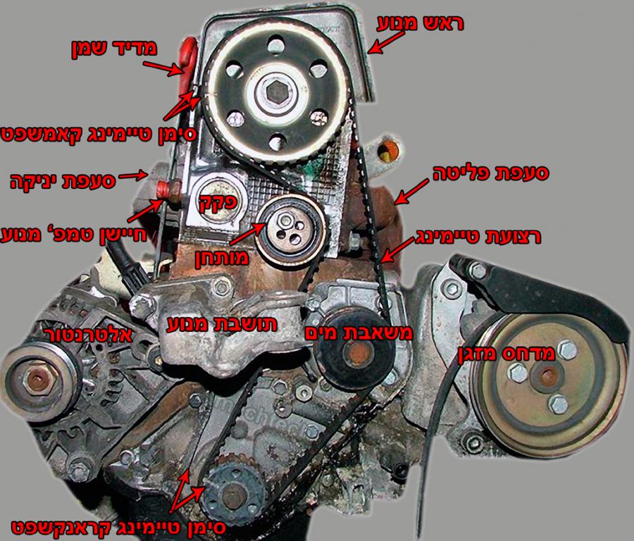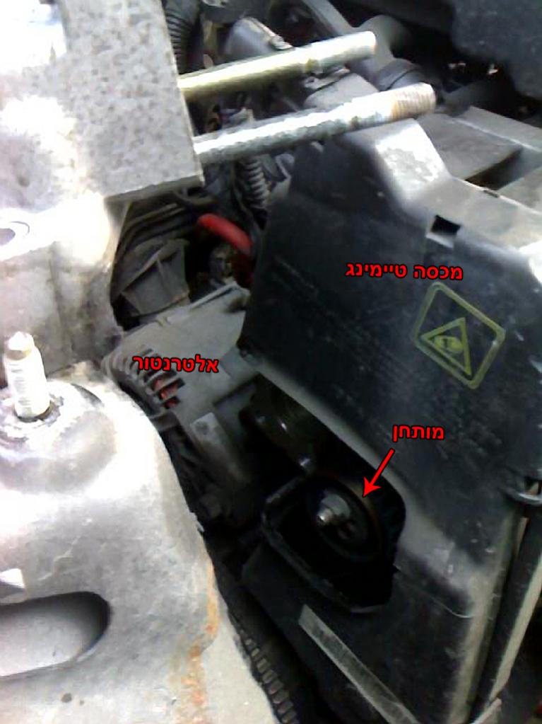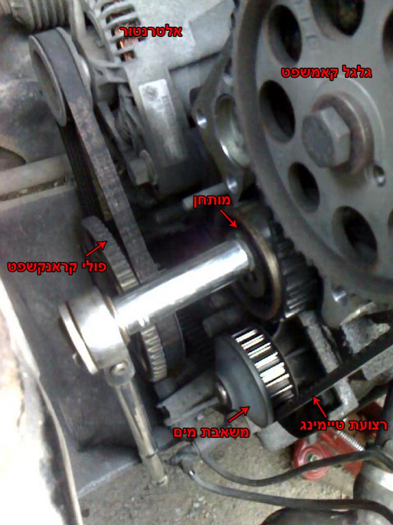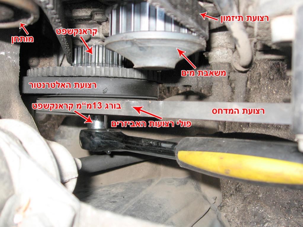 * במידה ולא מחליפים רצועת תיזמון, אלא רק מותחן או משאבת מים, יש לדלג על שלב שחרור האלטרנטור, המדחס ופירוק פולי הקראנקשפט, ולעבור ישר לשלב מתיחת רצועת הטיימינג.
