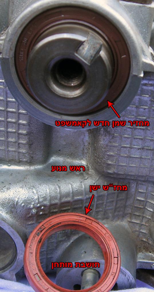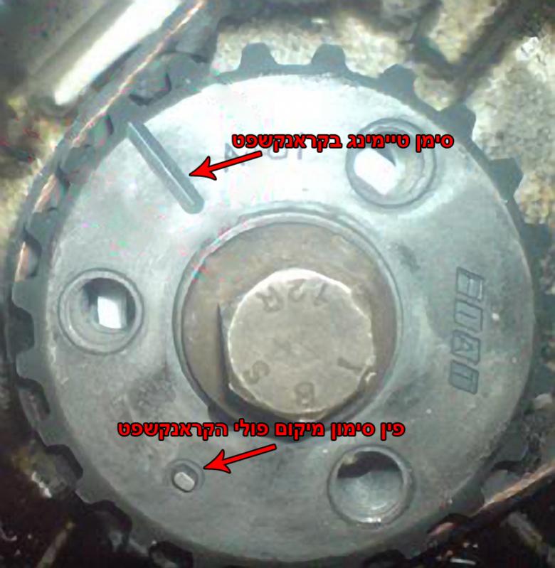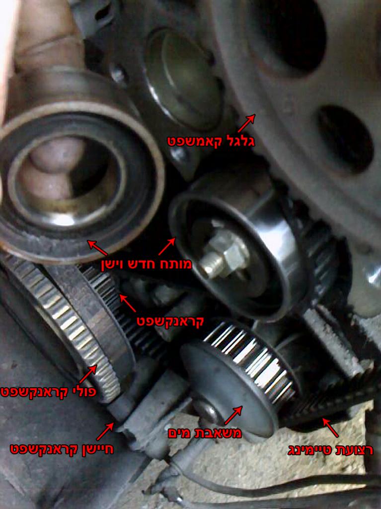 קובץ מצורף 6762 11. הסר את חציו העליון של המכסה ע"מ לחשוף את גלגל הקאמשפט ואת המותחן (בפונטו MK1 זה מכסה אחד שלם). קובץ מצורף 6765 12. שחרר בורג 10מ"מ נוסף ע"מ לשחרר את חציו התחתון של המכסה. קובץ מצורף 6764 13. כעת ניתן לראות את הקראנקשפט. קובץ מצורף 6766 14. כיוון תיזמון, חובה!!! טרם שחרור המותחן או הסרת רצועת תיזמון: יש לכוון את התיזמון באופן הבא: יש שלושה מקומות עם סימונים (חריצים מוטבעים) שחייבים להיות מיושרים ומכוונים: גלגל התנופה, הקראנקשפט וגלגל הקאמשפט (כשמכוונים את גלגל התנופה, הקראנקשפט יהיה מכוון אף הוא וזאת מפני שגלגל התנופה מחובר אל הקראנקשפט, גלגל התנופה מורכב על ציר הקראנק, פשוט מהצד של הגיר, כלומר אפשר לכוון TDC או מגלגל התנופה או מהקראנקשפט). תמונה של חלקי המנוע קובץ מצורף 6767 כיוון ראשון: TDC (נקודה מתה עליונה), כלומר בוכנה בצילינדר מס' 1 (הקרוב לטיימינג) צריכה להיות בנקודה הכי עליונה (בין פעולת דחיסה לעבודה). הכיוון נעשה ע"י פתיחת מכסה גומי קטן הנמצא בגוף הגיר מעל גלגל התנופה (על-יד התרמוסטט), בין המצבר לסלילי ההצתה, למי שלא מוצא :). קובץ מצורף 6768 סובב הקראנקשפט בעזרת ראצ'ט עם בוקסה 13מ"מ (קל יותר לסובב ללא מצתים, אך לא חובה לפרקם) כדי לכוון את התיזמון, הסתכל דרך הפתח שבגיר ותכוון שהחריץ שבגלגל התנופה ייתיישר עם סימן קו האפס (משולש המתכת הגדול מביניהם) המוטבע על בית הגיר. קובץ מצורף 6769 כעת כשזה מכוון, הסימון (החריץ) שבקראנקשפט אמור להתיישר עם הסימון על בלוק המנוע (שעה 10). בתמונה הסימונים עדיין לא מיושרים ביניהם. קובץ מצורף 6770 כיוון שני: החריץ (הסימון) שבגלגל הקאמשפט צריך להתיישר עם החריץ שבצד ראש המנוע, צד שמאל אחורי של הראש (שעה 9). קובץ מצורף 6771 15. כשהכל מכוון, רצוי לסמן בעזרת טיפקס סימן של קו אחד רציף על גלגל הקאמשפט, רצועת הטיימינג וראש המנוע. סימן של קו נוסף על הקראנקשפט, רצועת הטיימינג ובלוק המנוע. קובץ מצורף 6772 |