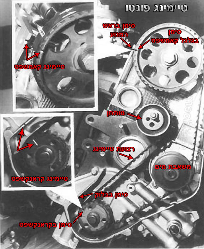 ------------------------------------------------------- אהלן חברים, מדי פעם עולות בקשות למדריך החלפת משאבת מים, זה מחייב מן הסתם גם שחרור של רצועת הטיימינג ויוצא בעצם גם מדריך להחלפת משאבה וגם מדריך לכיוון טיימינג. המדריך מתאים לפיאט פונטו עם מנוע 8 שסתומים MK2 ו- MK1, אבל יכול לתת איזשהו מושג בעניין הטיימינג ובעיקר לגבי החלפת משאבת מים גם ברכבים אחרים בעלי מנוע 8 שסתומים. * לידיעה: למנוע 16V צריך כלים "מיוחדים" לנעילה וכיוון, לכן מדריך זה אינו מתאים, למרות שראיתי בעבר ממסניק שביצע טיימינג לפונטו 16V של אישתו, ללא "הכלים" ופשוט עשה סימונים לטיימינג, הרכיב כמו שפירק, והצליח לו. לדעתי, לכל מי שיש ניסיון, בטוח ביכולות שלו ו"נעול" לבצע טיימינג ב-16V, אז לכל הפחות שישכור את הסט ממוסך או שישאיל/ירכוש סט ויעבוד עם ספר היינס ולא לקחת סיכונים מיותרים (זה לא כזה סיפור לבצע, אבל חובה! לעבוד עם כלים יעודיים וספר רכב, כי פה באמת אפשר בטעות לירות לעצמנו ברגל). רקע כללי ------ * בפונטו 8 שסתומים (מנוע Fire), המנוע הוא מסוג Non-Interfering Engine, ז'תומרת במקרה שרצועת התיזמון נקרעת בזמן פעולת המנוע, הסבירות לנזק כלשהו מלבד החלפת הרצועה נמוכה עד אפסית. * בפונטו 16 שסתומים, המנוע הוא מסוג Interfering Engine, כלומר במקרה שבו רצועת התיזמון נקרעת תוך כדי עבודת המנוע, לא יהיה תיזמון של השסתומים ולכן יווצר מפגש בין הבוכנות לשסתומים ובעברית עילגת: "חייך אכלת אותה". במקרה הטוב.. שיפוץ ראש מנוע. * Non-Interfering Engine, ראש המנוע בנוי באופן כזה שגם כאשר השסתומים נפתחים במלואם, הם לא יבלטו מראש המנוע אל תוך הצילינדרים בהם נעות הבוכנות. * Interfering Engine, כאשר השסתומים נפתחים במלואם, הם בולטים החוצה מראש המנוע אל תוך חלל הצילינדרים בהם נעות הבוכנות (תכנון בעל ניצולת גבוהה יותר), והתיזמון בין הקאמשפט לקראנקשפט מונע בעצם מפגש בין השסתומים לבוכנות. רצועת תזמון יש להחליף לפי הוראות יצרן הרכב (זה מופיע בספר הרכב) בד"כ כל 60,000 ק"מ. עם החלפת הרצועה יש להחליף גם את מותח רצועת התזמון (המותחן הוא בעצם סוג של מיסב). אי החלפת מותחן בזמן עלולה להביא להתפרקות של המיסב עקב בלאי וכתוצאה שחרור של הרצועה תוך כדי עבודת המנוע. לרוב, מומלץ בזמן החלפת רצועת טיימינג להחליף יחד גם את משאבת המים משיקולי זמן עבודה ($), מהסיבה שבהחלפת משאבה נדרש לבצע טיימינג בכל מקרה. החלפת משאבת מים כל 60K ק"מ יחד עם הטיימינג גם מאפשרת לנו מעט שקט נפשי בנוגע להתחממות כתוצאה של משאבה תקולה. בנוסף, רוב הסיכויים שהמשאבה אכן תתפקד במיטבה במשך 60K. באותה הזדמנות, יש לבדוק את מחזיר השמן הנמצא בציר הקאמשפט ואת מחזיר השמן בציר הקראנקשפט, לבדוק שאין נזילות/הזעות של שמן, רצוי להחליפם למרות שזה כרוך בפירוק פולי וגלגל הקראנקשפט ובנוסף גם את גלגל הקאמשפט. להחלפת מחזירי השמן צריך שיהיה כלי מיוחד לנעילת הקאמשפט (מידע נוסף בלינק כאן בהודעה מס' 49) ובנוסף לשחרור בורג הקראנקשפט יש לימנוע מהקראנק מלהסתובב בזמן פתיחת הבורג(מידע בלינק כאן בסוף הודעה מס' 2), כמו כן דרוש דוקרן לחילוץ מחזירי השמן. כמובן שישנם מקרים בהם אין צורך להחליף מותחן או משאבת מים וזה במידה שהמשאבה או המותחן הוחלפו לאחרונה. גם אם המותחן הוחלף לאחרונה יש לבדוק האם הוא משמיע רעש בזמן פעולתו, האם מסתובב עם חיכוך, האם קיים חופש בטבעת הפנימית, האם יש סימני חלודה, האם האטמים יבשים/פגומים. במשאבה בלוייה, עלולה להיווצר נזילת מים החוצה, או לחילופין כניסה של אוויר אל המערכת דרך ציר המשאבה וזאת כתוצאה של חופש בציר עקב מיסב גמור, או אטמים יבשים (לרוב, מיסב גמור ישמיע גם רעש). ישנם מקרים שבהם הכנפיים של האימפלר (מאיץ) נאכלו, או שהאימפלר מחליק על הציר ואז המשאבה מבצעת רק סירקולצייה חלקית של נוזל הקירור במערכת, מה שמביא להתחממות המנוע (במקרה של התחממות, ניסיון של הוצאת אוויר מהמערכת, הסרת התרמוסטט או ניקוי הרדיאטור לא יעזור כמובן). אפשר לבצע בדיקה של המשאבה ללא פירוקה ע"י בדיקה ויזואלית- מצב האטם, האם יש סימני