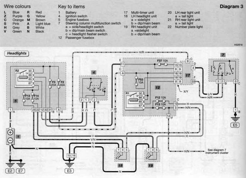 נורת חזית ימנית מס' 19 בתרשים, מחוברת עם חוט שחור (מינוס), חוט ירוק (אור דרך, נתיך F14 בתא מנוע 10A) וחוט אפור (נתיך F12 אור מעבר, נתיך בתוך הרכב 10A).