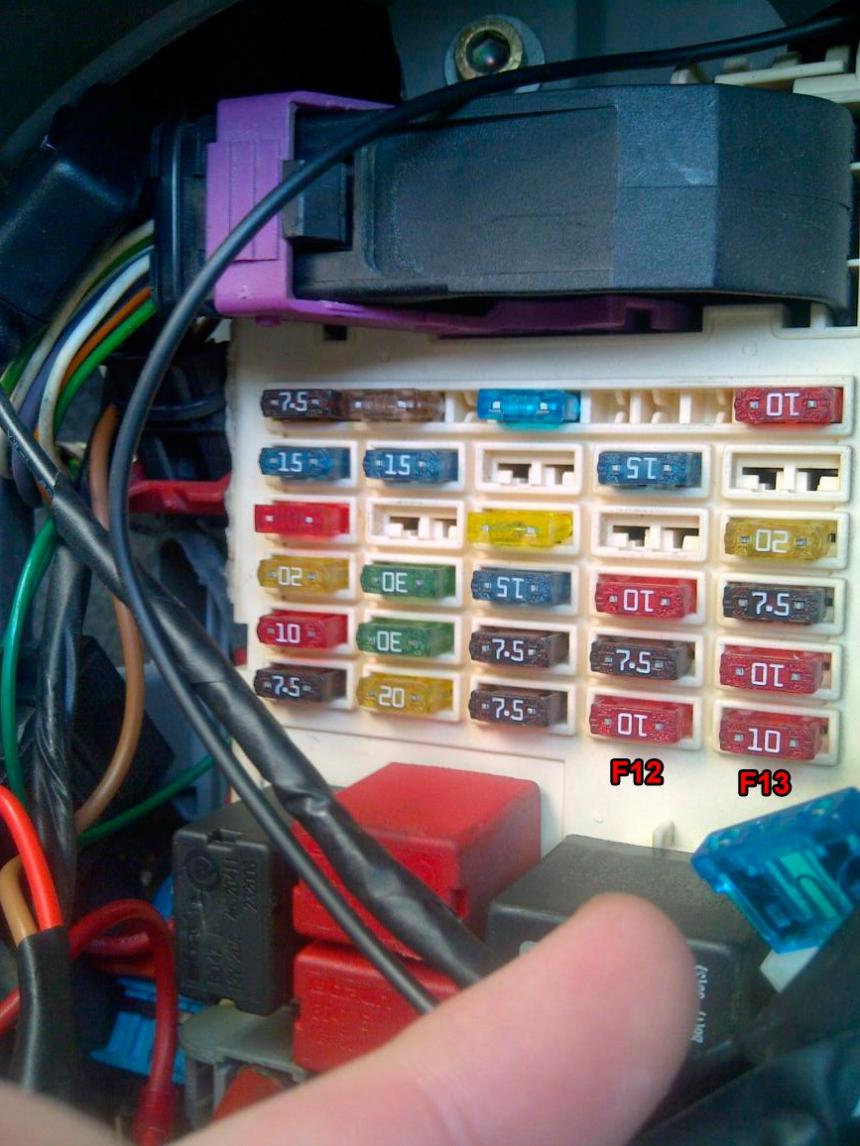 תיבת הנתיכים בתוך הרכב, סובבתי את התמונה כדי שתתאים לתרשים שצירפתי (נתיך F12 אור מעבר ימני. נתיך F13 אור מעבר שמאלי).
