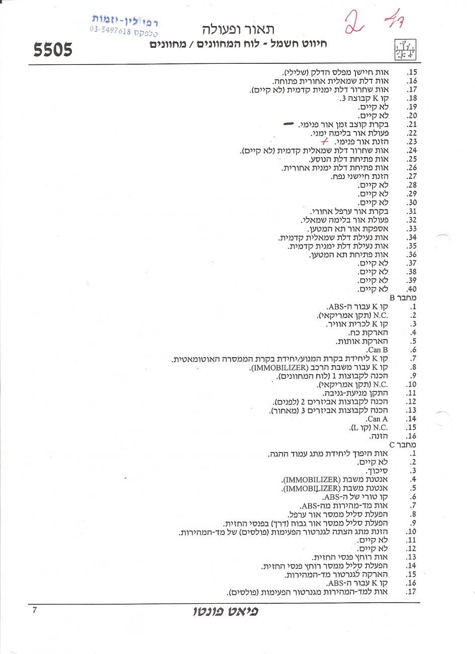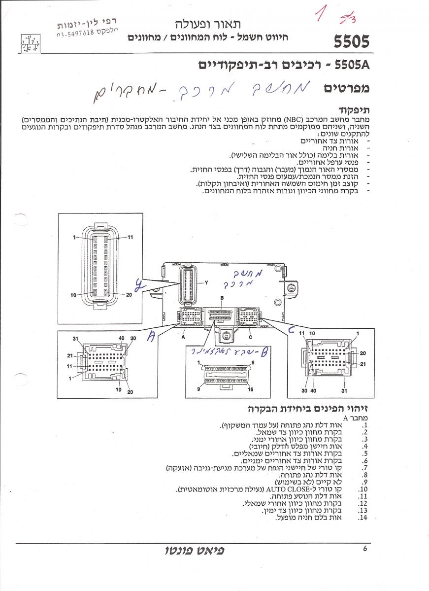 אזהרה - מע' האתותים בפונטו ספייס מופעלת ע"י המחשב המרכזי ברכב (מחשב מרכב) וכל טעות בחיבורי חשמל עלולה לגרום לנזק יקר בו. האות להפעלת איתותים הנו אות פיקוד מינוס, הן מידית האתות (לימין או לשמאל) והן ממתג איתותי החרום, כך שלא תוכל להתחבר אליהם. כן תוכל להתחבר אל החוטים היוצאים ממחשב המרכב אל פנסי צד שמאל (חוטים בצבע ורוד/לבן SB) ואל פנסי צד ימין (חוטים בצבע ורוד S). מצ"ב שרטוט מע' האתותים עם מקרא של המחברים ומה מתחבר לכל פין והשווה המקרא ברשימה אל השרטוט ותדע כל חוט את מיקומו בכל מחבר. מחשב המרכב מחובר אל החלק האחורי של תיבת הנתיכים בדשבורד. בהצלחה ובברכה - רפי לין