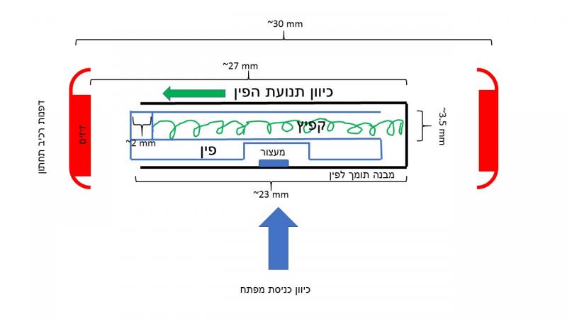 * כרגע לא מצליח להעלות תמונות מהפירוק, אז מצרף רק תרשים סכמטי של המנגנון עם המימדים הרלוונטיים - (אורך הקפיץ כ-25 מ"מ, קוטר הקפיץ כ-3.5 מ"מ)