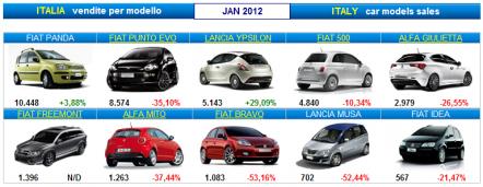 מצורפץ טבלת מכירות רכב איטלקי, באיטליה בינואר 2012.