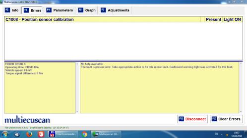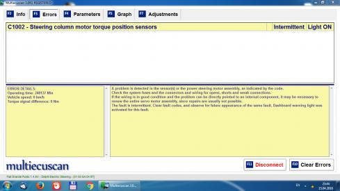 בבדיקת מחשב עם תוכנת multiecuscan הופיעו 2 תקלות: C1002, C1008. בזמן מעקב אחר זווית ההגה עם מנוע מונע(עם התוכנה) לא נרשם שינוי והזווית נשארת ב-0 מעלות (עפ"י המחשב) למרות סיבוב ההגה.