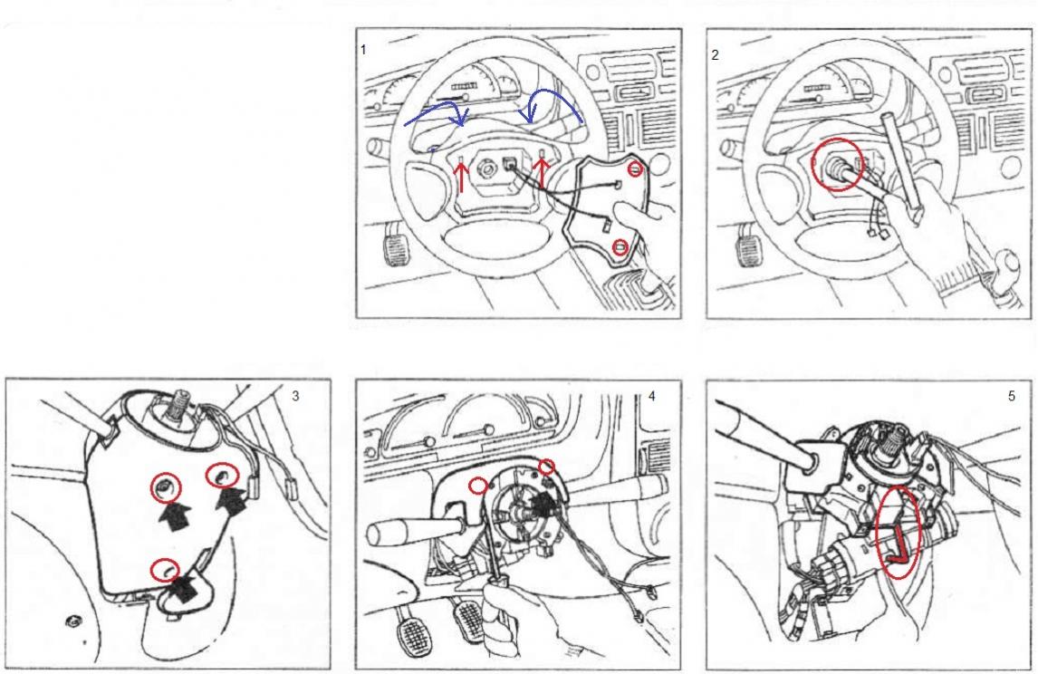 בתמונה ראשונה סימנתי באדום את ההברגות של הברגים בצפצפה, בכחול סימנתי לך את מיקום הבורג העצמו שמחזיק את הצפצפה (בצד האחורי של גלגל ההגה). אתה צריך לפרק את 2 הברגים האלה ואז תוכל להוציא את הלחצן של הצופר. בתמונה 2 אתה צריך לשחרר את האום כדי לפרק את גלגל ההגה ממיקומו. בתמונה שלישית אתה מפרק את 3 הברגים שבתמונה ומוריד את הפלסטיק התחתון. בתמונה 4 אתה מפרק את 2 הברגים (ראה את מיקום המברג, הברגים מוסתרים ונפתחים בדיוק כמו שמסומן בתמונה) ומוריד את הפלסטיק העליון. בתמונה 5 סימנתי לך את מפתח אלן באדום, איתו אתה משחרר את הבורג שמחזיק את המנגנון האיתותים ומושך את כל המנגנון החוצה. הרכבה בסדר הפוך. בהצלחה, אתה יכול להתקשר אלי, אני ייכוון אותך. נערך לאחרונה על ידי Lexxxa : 19-06-10 ב 11:14. |