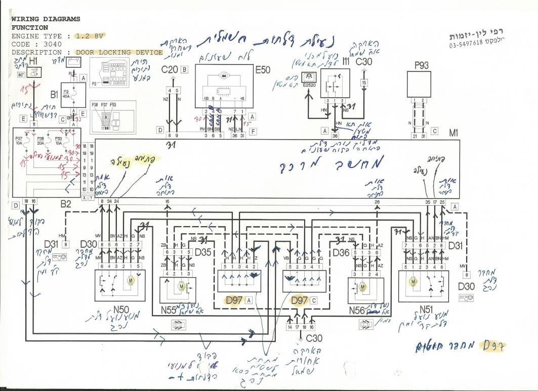 האות (מינוס) לפתיחת הדלתות הנו בחוט סגול/תכלת AZ. האותו האלו נשלחים אל מחשב המרכב (המחשב המרכזי ברכב) שמצידו מוציא מתח מתאים להפעלת מנועי הנעילת/פתיחת הדלתות. בכל דלת יש חיישן קטן שמדווח על דלת פתוחה ואז לא ניתן לנעול את דלתות הרכב, חשמלית. מצורף שרטוט המערכת. בברכה - רפי לין