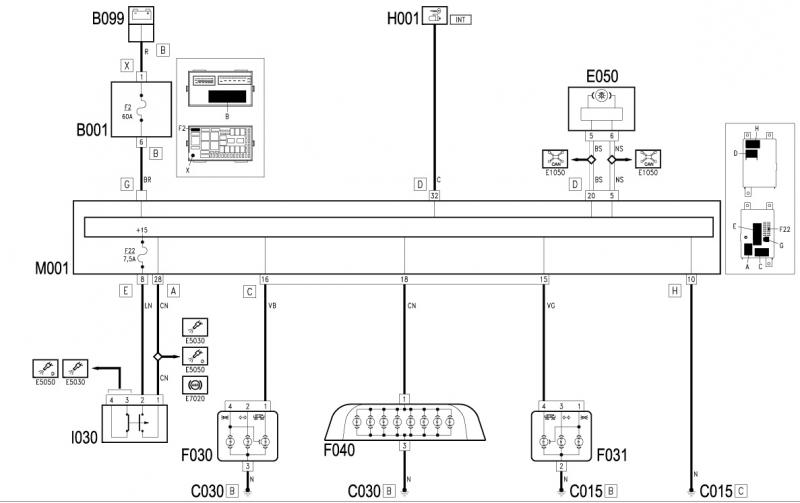 פנס בלם שלישי (F040) (ראה תמונות מצורפות), כמו גם הפנסים הצידיים, מחובר ישירות ל"מחשב". יש נתיך אחד (F22) שמשותף לשלושת הפנסים, כך שבמקרה שלך, עם שני הפנסים בצידי הרכב דולקים- הנתיך לא אשם.