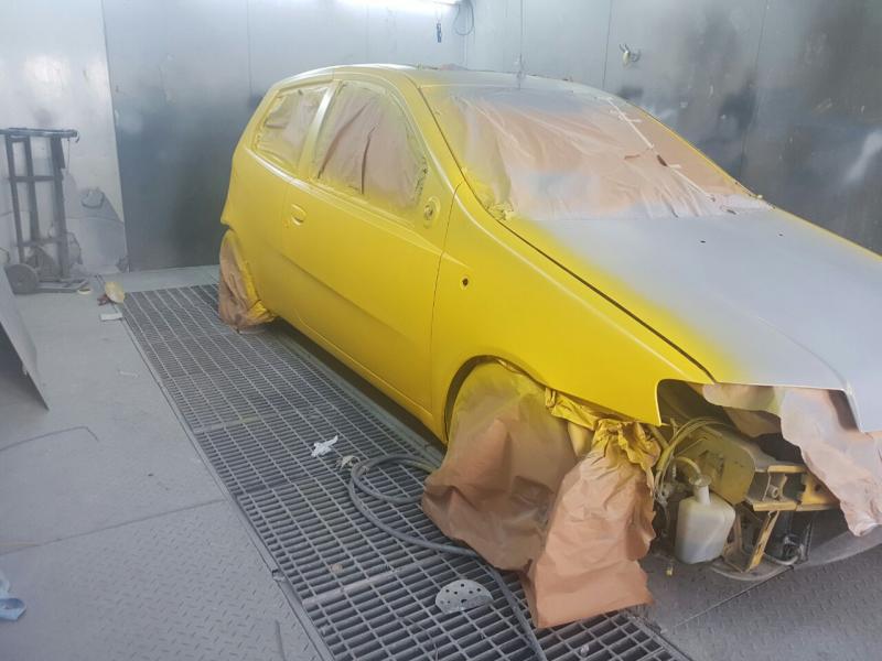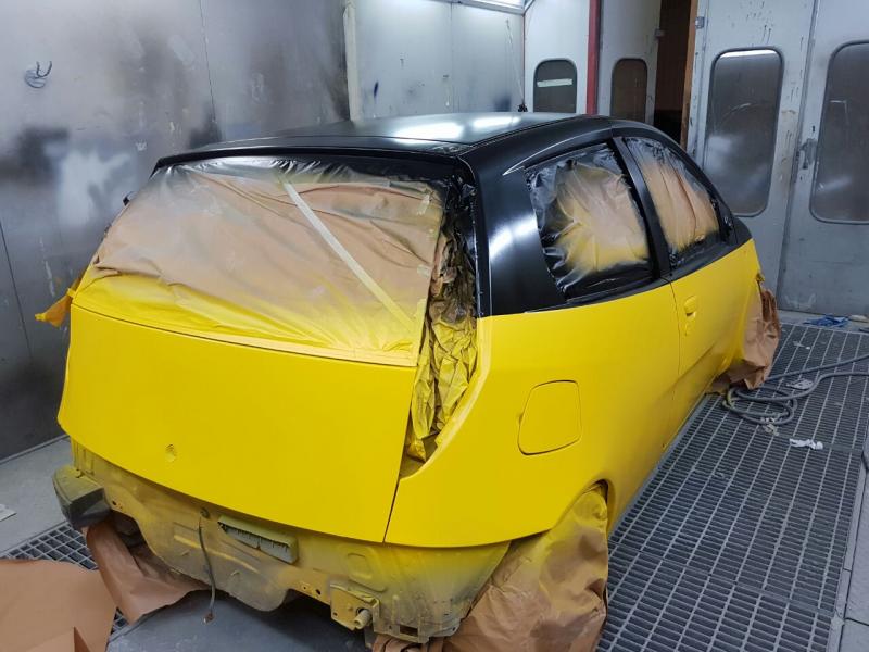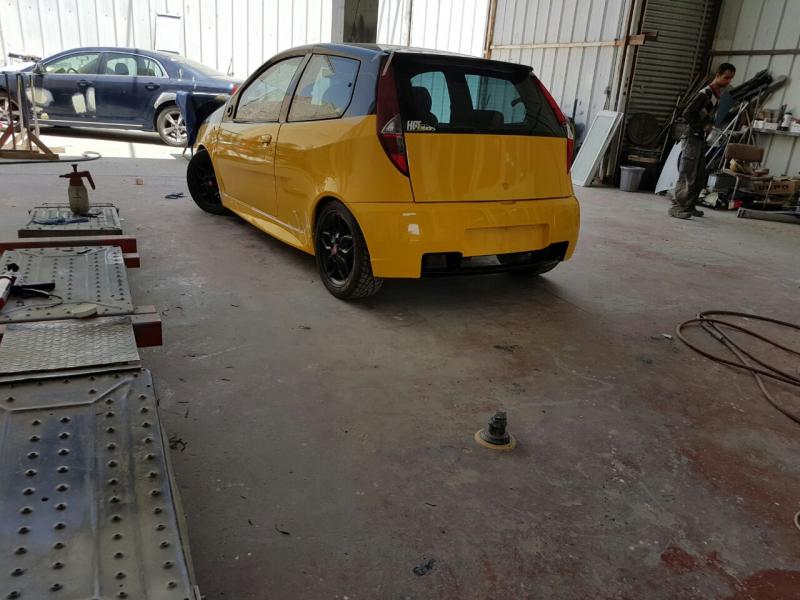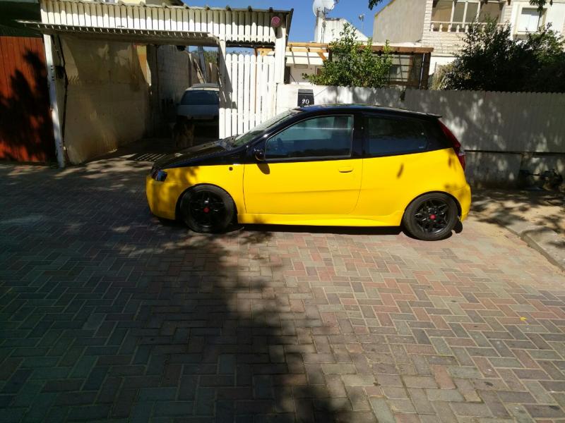 טוב אז ככה, אני הבעלים של הרכב הזה, זו פונטו hgt אבארט מקורית בצבע צהוב, הרכב נקנה בינואר השנה כשהוא בצבע כסוף מט, הרכב נראה מזעזע גם בגלל הגוון הלא מתאים לרכב וגם בגלל איכות הצביעה הירודה בלשון המעטה, הוחלט לעשות פרויקט צבע כללי לרכב, אבל לא רציתי לחזור לצהוב המקורי כי 90% hgt בארץ צהובות, אחרי חודשים של חיפוש אחר צבע מעניין הבנתי ששינוי צבע כללי אני לא רוצה לכן הוחלט לשלב צבע נוסף אם הצהוב המקורי, זה הראיון שקפץ לי לראש, וביקשתי מחבר לעשות הדמיה בפוטושופ, אהבתי את התוצאה של ההדמיה, והתוצאה הסופית לפניכם, כמובן שהרכב פורק מכל מה שניתן לפרק לפני הצבע, וכל חלק נצבע בנפרד (טמבונים, חצאיות, מראות וכו.) כל הפרויקט הושלם בשלוש שבועות, אם יש שאלות נוספות בנושא אשמח לענות.