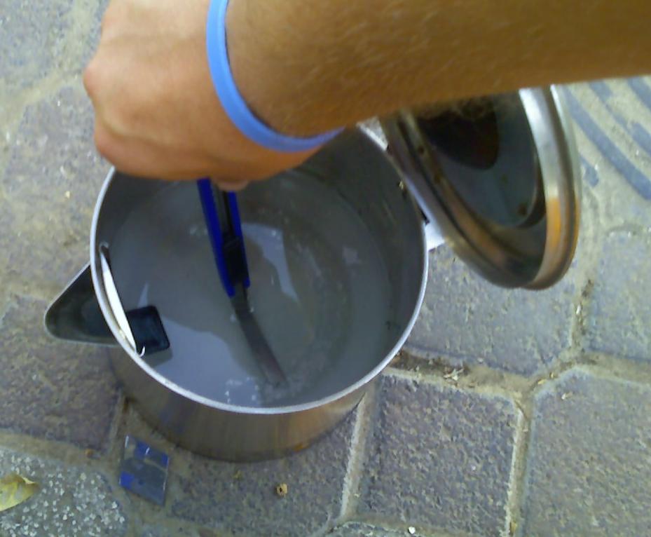 כעת נשארנו בלי סמלים אבל רק עם הדבק , יש להרתיח מים ולשפוך על הדבק תוך כדי שיפשוף עם המגבת זמן רב - בשלב הזה צריך הרבה מאוד סבלנות זה לוקח זמן - מי שרוצה לזרז תהליכים יכול לנקות עם דלק(לא מומלץ)