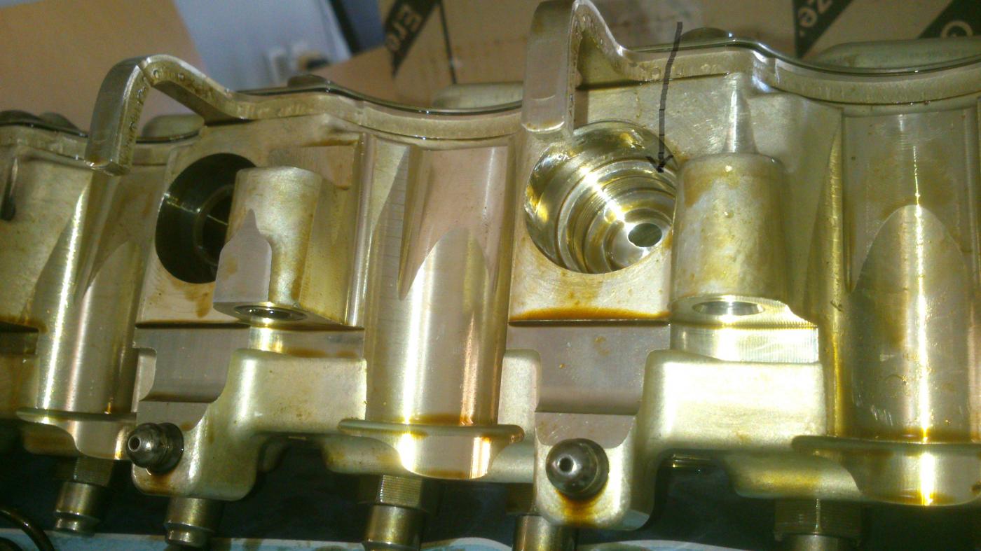 ככה זה נראה .החצים מסמנים את מיקום ההברגה התקולה של צילינדר 3 ואת הכוסית נקרא לזה שאמורה להיות מוברגת בפנים :