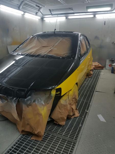 טוב אז ככה, אני הבעלים של הרכב הזה, זו פונטו hgt אבארט מקורית בצבע צהוב, הרכב נקנה בינואר השנה כשהוא בצבע כסוף מט, הרכב נראה מזעזע גם בגלל הגוון הלא מתאים לרכב וגם בגלל איכות הצביעה הירודה בלשון המעטה, הוחלט לעשות פרויקט צבע כללי לרכב, אבל לא רציתי לחזור לצהוב המקורי כי 90% hgt בארץ צהובות, אחרי חודשים של חיפוש אחר צבע מעניין הבנתי ששינוי צבע כללי אני לא רוצה לכן הוחלט לשלב צבע נוסף אם הצהוב המקורי, זה הראיון שקפץ לי לראש, וביקשתי מחבר לעשות הדמיה בפוטושופ, אהבתי את התוצאה של ההדמיה, והתוצאה הסופית לפניכם, כמובן שהרכב פורק מכל מה שניתן לפרק לפני הצבע, וכל חלק נצבע בנפרד (טמבונים, חצאיות, מראות וכו.) כל הפרויקט הושלם בשלוש שבועות, אם יש שאלות נוספות בנושא אשמח לענות.