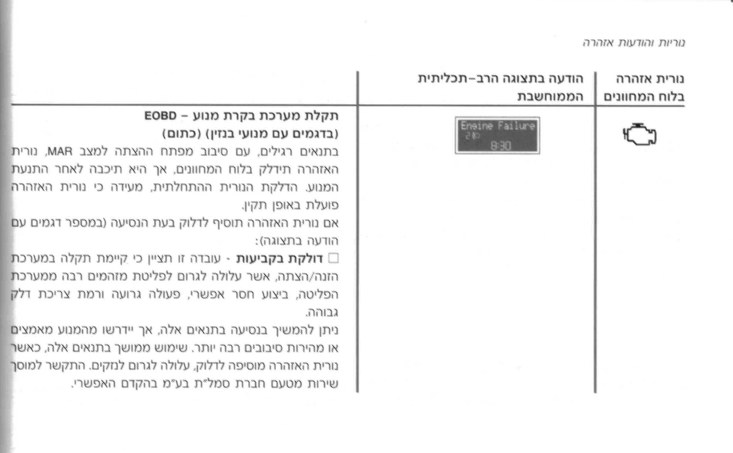 למען הדיוק, הנורה נדלקת כשיש תקלה במע' נהול המנוע הכוללת הצתה, הזרקת דלק וגורמי מניעת זיהום אויר כקניסטר פחם, ממיר קטליטי ועוד.