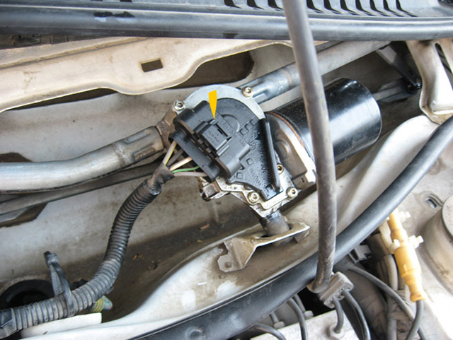 5. מנוע המגבים: לחיבור החשמל יש קליפס קטן שתופס אותו (חץ). לאחר ניתוקו פותחים את 5 ברגי הכוכב. כדאי להתחיל מהעליונים ביותר שהגישה אליהם קצת צפופה.
