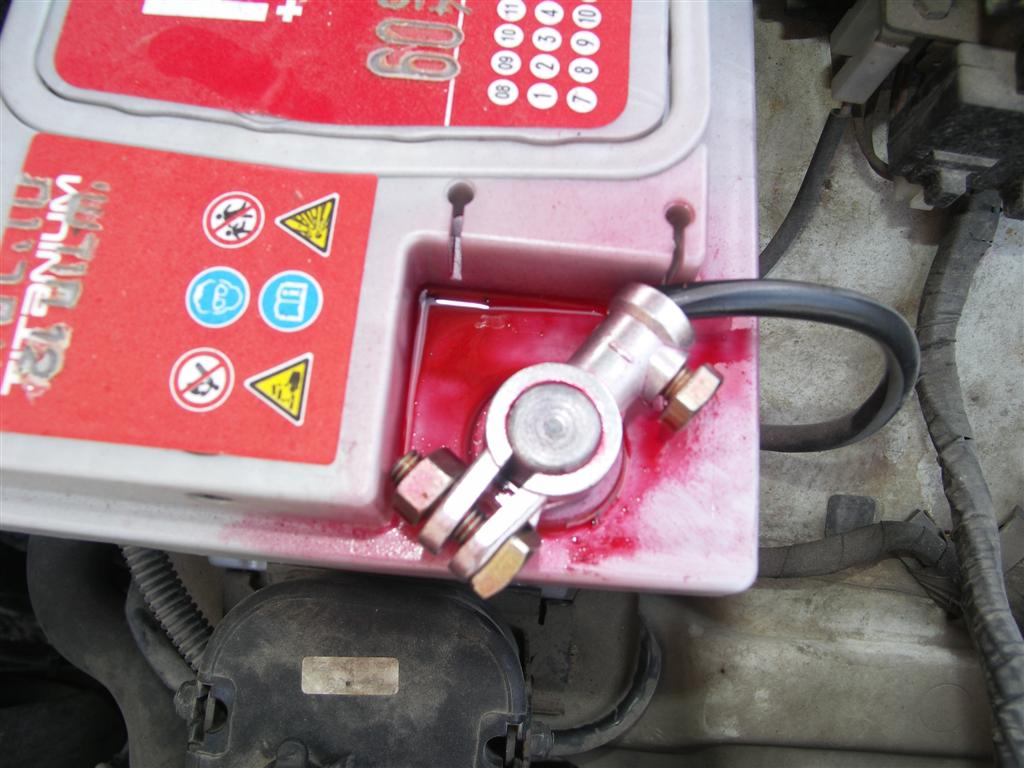 כפי שאולי ניתן לראות בתמונות בדקתי עם האצבע ויש לזה מרכם סמיך אך נוזלי.גם אם זה מים שהגיעו מאיפשהו אני לא מבין מה זה הצבע האדום ולכן אני כן חושב שזה תרסיס כלשהו אבל זה עדיין מוזר כי זה לא משהו שהיה מהתחלה אלה הופיע באיזשהו שלב כמה שבועות לאחר התקנת המצבר. כמו כן זה נמצע רק על המגעים ולא הגיע לשום מקום אחר. אני אבדוק זאת בכל מקרה אצל בעל מקצוע.