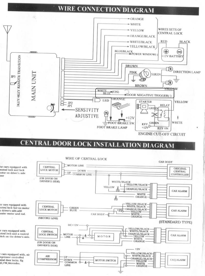 יש שני חוטים של האזעקה שצריכים להתחבר לטריגר של הדלת שכאשר היא נפתחת (ואז אמור להדלק האור בתא הנוסעים) האזעקה אמורה לצפצף כאילו פתחת את הדלת בלי לנטרל את האזעקה. ושני החוטים האלה אמורים להפעיל מצב של נעילה פסיבית, כלומר אם בטעות נלחץ הכפתור בשלט של הפתיחה ולא נפתחה הדלת תוך 30 שניות, אז האוטו ננעל שוב והאזעקה נדרכת אוטומטית. מקווה שהסברתי את עצמי נכון. נ.ב אני שונא לרשום את המילה "אזעקה".