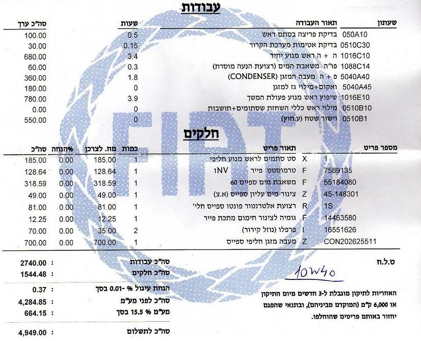 וזו קבלת הטיפולים שנעשו אצל שמשון ביומיים האחרונים - החלפת ראש מנוע לראש משופץ, החלפת מעבה מזגן, ומליון תיקונים מסביב.