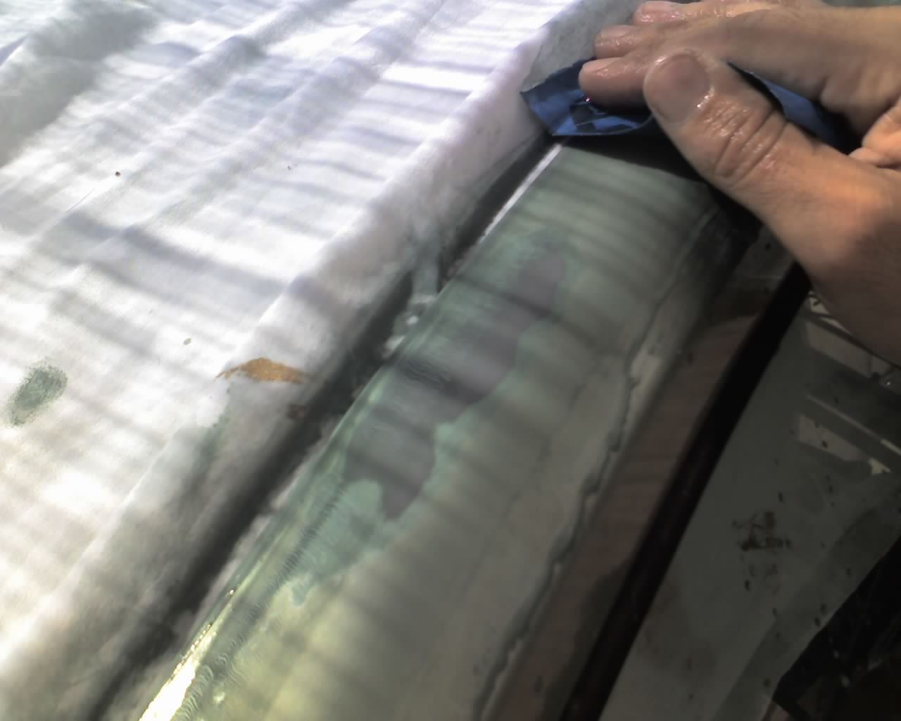 שיוף האיזור הפגוע, בעדינות אך ביסודיות, בעזרת ניירות מים. תחילה עם נייר גס יותר (600) ואח"כ עם נייר עדין יותר (1500). למרבה ההפתעה, לניירות מיים קוראים כך כי בשביל לעבוד איתם צריך לטבול אותם ב... יפה! מים. יש לשייף עד שהאיזור חלק למגע, לנגב בעזרת סמרטוט לח (להורדת האבק שיבש ונדבק) ולייבש. קשה לתפוס באיזו קלות יורד הצבע השרוף. הצבע ה"בריא" לא ירד בכזו קלות ולכן סיכוי הנזק הוא מינימלי.