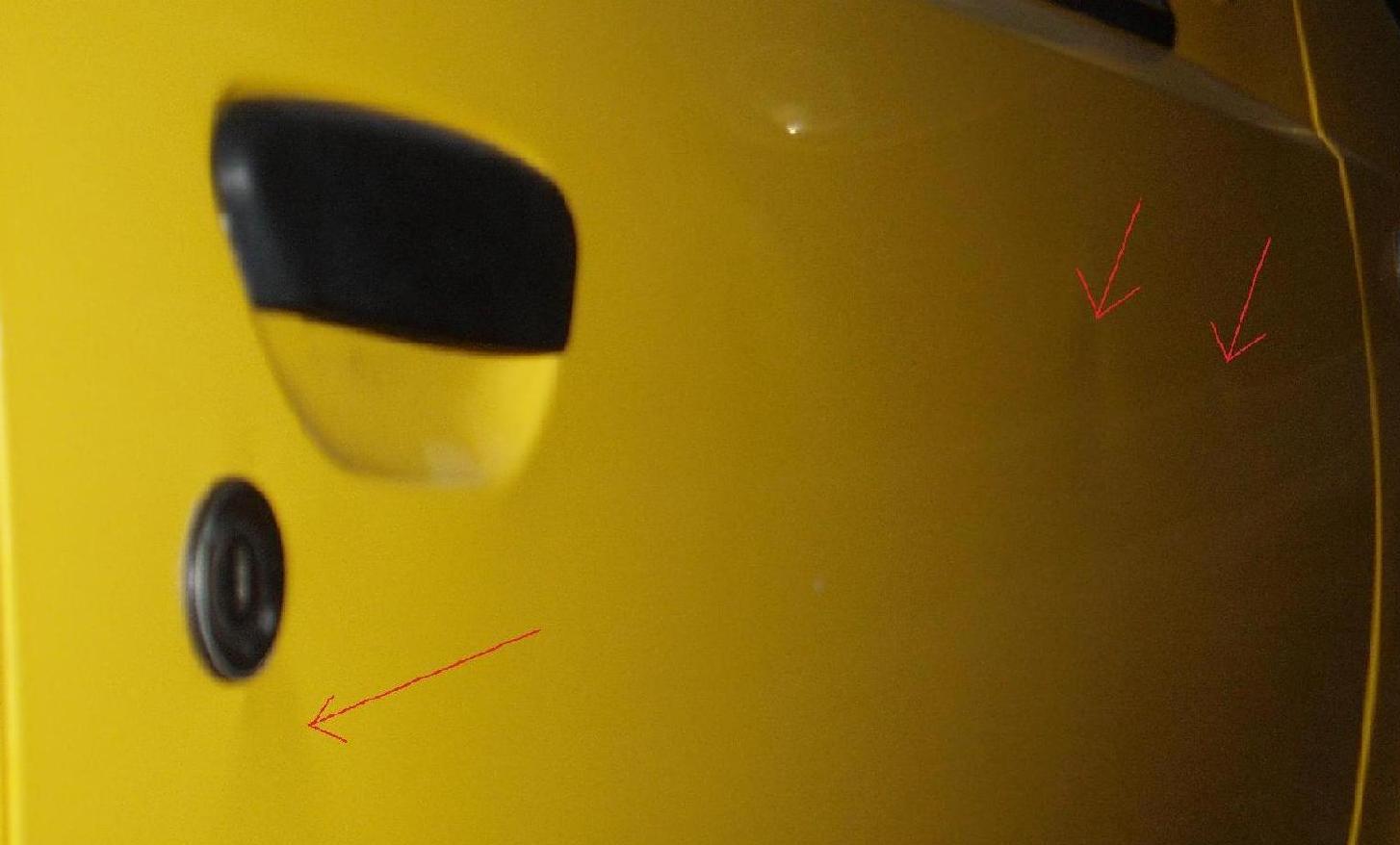 צירפתי תמונות של המעיכות בדלת הנוסע- סימנתי חיצים אדומים המצביעים על המעיכות + תמונות של השריטות בפגוש האחורי - ניתן לראות את הבדלי הצבע בין הפגוש למכסה תא המטען. ( הפגוש בהיר יותר ).