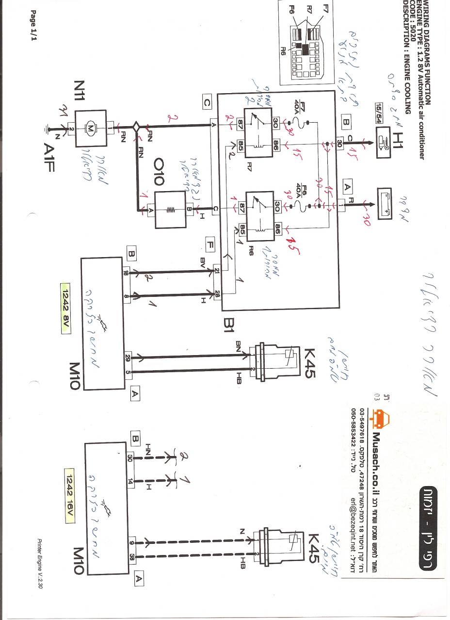 תרגום צבעי החוטים: H - אפור R - אדום B - לבן A - תכלת N - שחור C - כתום V - ירוק יש חוטים עם שני צבעים ולדוגמא: AN שזה תכלת/שחור. הממסרים והנציכים של מאורר הרדיאטור, נמצאים בתיבת הנתיכים שבתא המנוע (ליד המצבר) ובשרטוט יש גם ציור שלה עם מיקום הממסרים והנתיכים. בהצלחה ובברכה - רפי לין