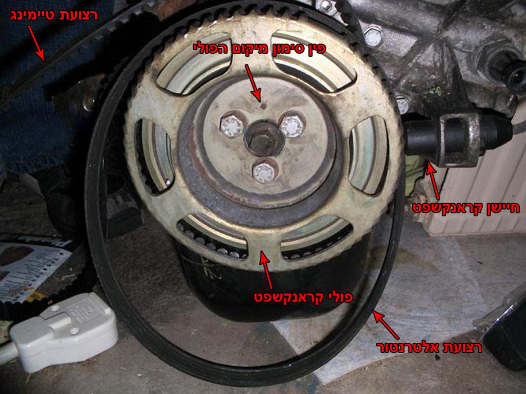 * במידה ולא מחליפים רצועת תיזמון, אלא רק מותחן או משאבת מים, יש לדלג על שלב שחרור האלטרנטור, המדחס ופירוק פולי הקראנקשפט, ולעבור ישר לשלב מתיחת רצועת הטיימינג.