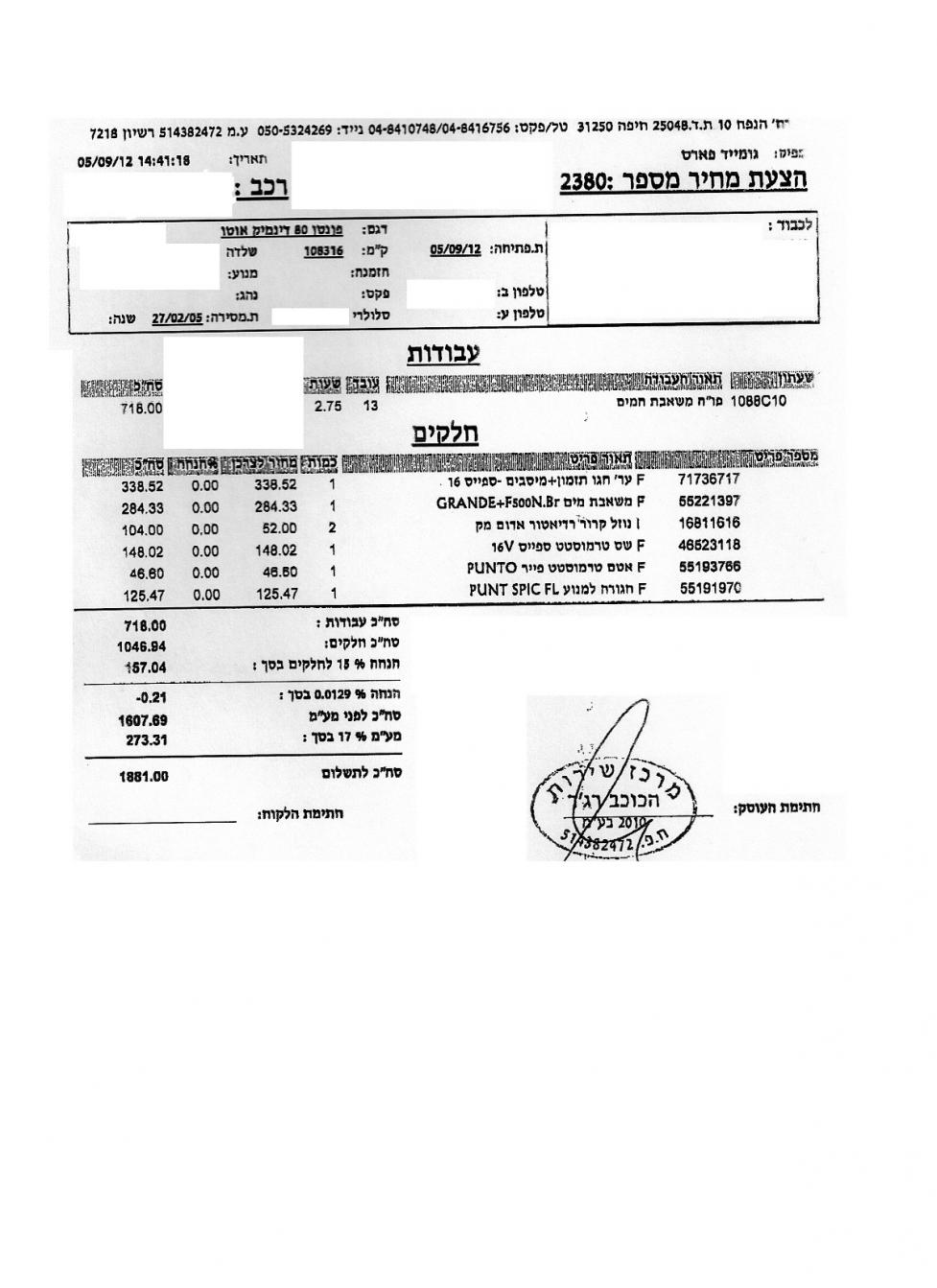 אתה יכול לגשת לכל מוסך ולבקש הצעת מחיר לעבודה ולדרוש חלקים מקוריים !
