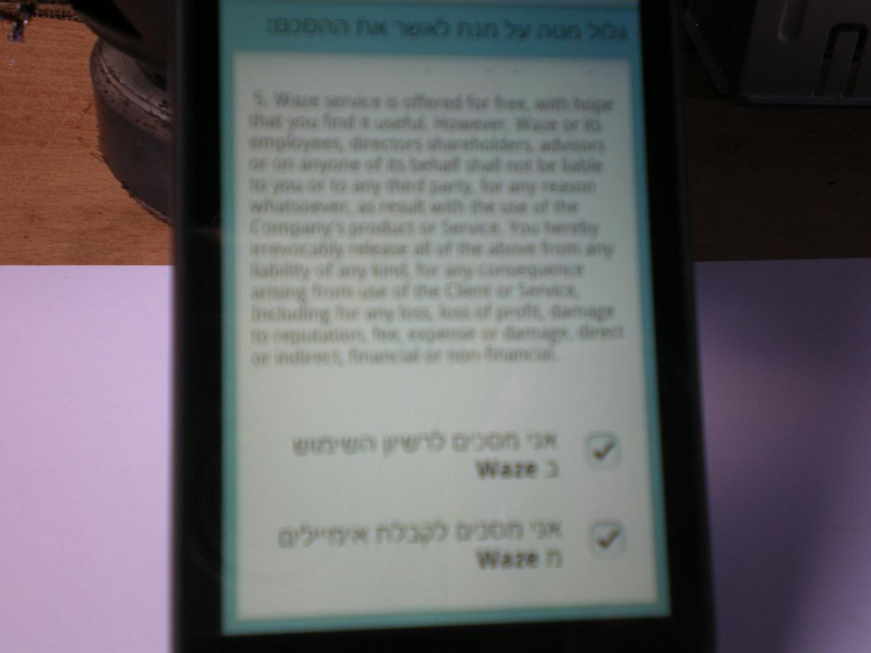 מאתמול כאשר אני נכנס ל-WAZE, אני מקבל את החלון הבא. לאחר שאני מאשר את ההסכם, אין לי שום אופציה להמשיך.