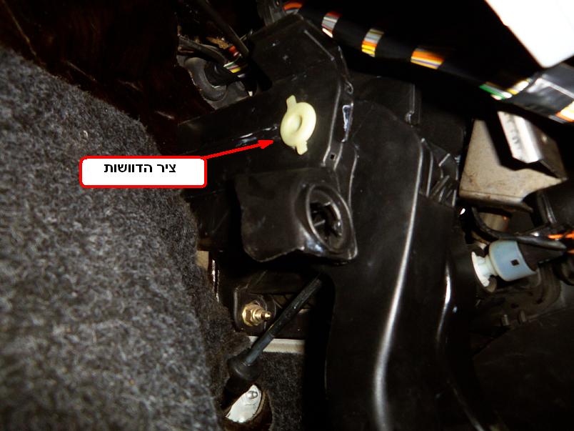 איזור הדוושות הוא איזור בעייתי בגישה אליו לכן לא הכי קל לעבוד שם . ראשית יש לשלוף את הקליפס שתופס את ציר הדוושות בצידו הימיני ( מתואר בתמונה אם כי במטושטש , כשתביטו לאיזור תבינו על מה אני מדבר ) הגישה אליו קצת בעייתית כי הוא יושב צמוד לקופלינג (ציר טלסקופי שמעביר תנועה סיבובית מהמוט הגה למסרק ההגה) את הקליפס שולפים כאשר מרימים מעט לשונית אחת של החלק המתפצל שלו ודחיפת הקליפס לצידו הנגדי . לאחר הוצאת הקליפס מישכו את הציר לאט מצידו השמאלי ( אפשר להתחיל עם מברג ), בעדינות זה פלסטיק. תוציאו אותו כך שיבלוט החוצה 10 ס"מ, ולא יותר מזה !!! לא מוציאים לגמרי את הציר !!! לכן יש לעשות את זה לאט ולהפעיל מעט כוח כדי לא לשלוף אותו בטעות לגמרי .( הוצאת הציר לגמרי אפשרית אבל מצריכה שיטה אחרת כי אז קשה מאוד להחזיר אותו !!! וגם יש אפשרות שקפיץ מחזיר דוושה יתנתק ממקומו שגם אותו זה די מטרד להחזיר ) שימו לב שהדוושות פחות או יותר במקומן ולא זזו . עכשיו תגרזו את הציר מסביבו, בחלקו הבולט החוצה , תגרזו גם עם מקל צמר גפן (או משהו יותר ארוך ) מצד ימין של הדוושות בתוך הפיר שהציר יושב, תגרזו בין צידי הדוושה איפה שהציר יושב, יש שם בוקסות פלסטיק כאלו, תדחפו שם גריז עם מברג או משהו ( מנה נדיבה ) ואם תצליחו מכל כיוון זה טוב .