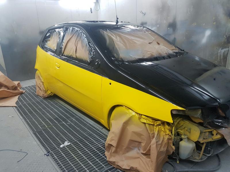 טוב אז ככה, אני הבעלים של הרכב הזה, זו פונטו hgt אבארט מקורית בצבע צהוב, הרכב נקנה בינואר השנה כשהוא בצבע כסוף מט, הרכב נראה מזעזע גם בגלל הגוון הלא מתאים לרכב וגם בגלל איכות הצביעה הירודה בלשון המעטה, הוחלט לעשות פרויקט צבע כללי לרכב, אבל לא רציתי לחזור לצהוב המקורי כי 90% hgt בארץ צהובות, אחרי חודשים של חיפוש אחר צבע מעניין הבנתי ששינוי צבע כללי אני לא רוצה לכן הוחלט לשלב צבע נוסף אם הצהוב המקורי, זה הראיון שקפץ לי לראש, וביקשתי מחבר לעשות הדמיה בפוטושופ, אהבתי את התוצאה של ההדמיה, והתוצאה הסופית לפניכם, כמובן שהרכב פורק מכל מה שניתן לפרק לפני הצבע, וכל חלק נצבע בנפרד (טמבונים, חצאיות, מראות וכו.) כל הפרויקט הושלם בשלוש שבועות, אם יש שאלות נוספות בנושא אשמח לענות.