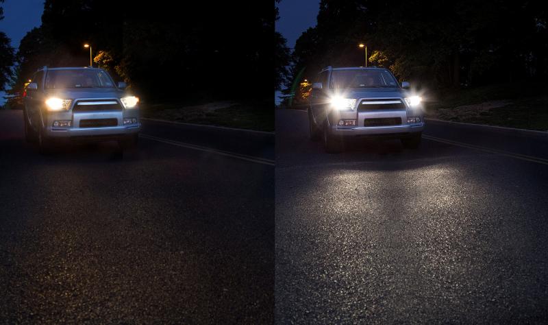 מצד ימין, הרכב עם פנסים תקינים ועוצמת אור חזקה עם פיזור אור נכון - מצד שמאל, פנסי הרכב עכורים ועוצמת האור חלשה.
