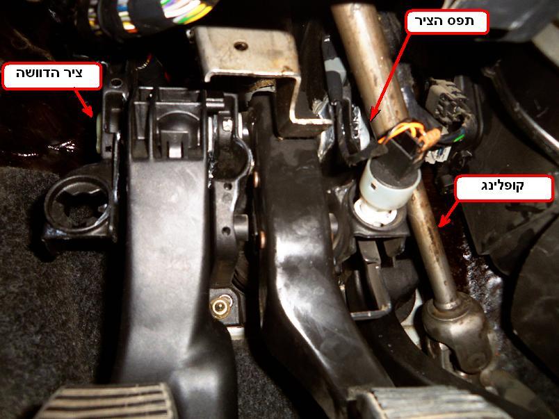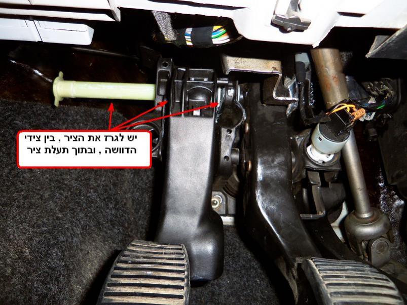 איזור הדוושות הוא איזור בעייתי בגישה אליו לכן לא הכי קל לעבוד שם . ראשית יש לשלוף את הקליפס שתופס את ציר הדוושות בצידו הימיני ( מתואר בתמונה אם כי במטושטש , כשתביטו לאיזור תבינו על מה אני מדבר ) הגישה אליו קצת בעייתית כי הוא יושב צמוד לקופלינג (ציר טלסקופי שמעביר תנועה סיבובית מהמוט הגה למסרק ההגה) את הקליפס שולפים כאשר מרימים מעט לשונית אחת של החלק המתפצל שלו ודחיפת הקליפס לצידו הנגדי . לאחר הוצאת הקליפס מישכו את הציר לאט מצידו השמאלי ( אפשר להתחיל עם מברג ), בעדינות זה פלסטיק. תוציאו אותו כך שיבלוט החוצה 10 ס"מ, ולא יותר מזה !!! לא מוציאים לגמרי את הציר !!! לכן יש לעשות את זה לאט ולהפעיל מעט כוח כדי לא לשלוף אותו בטעות לגמרי .( הוצאת הציר לגמרי אפשרית אבל מצריכה שיטה אחרת כי אז קשה מאוד להחזיר אותו !!! וגם יש אפשרות שקפיץ מחזיר דוושה יתנתק ממקומו שגם אותו זה די מטרד להחזיר ) שימו לב שהדוושות פחות או יותר במקומן ולא זזו . עכשיו תגרזו את הציר מסביבו, בחלקו הבולט החוצה , תגרזו גם עם מקל צמר גפן (או משהו יותר ארוך ) מצד ימין של הדוושות בתוך הפיר שהציר יושב, תגרזו בין צידי הדוושה איפה שהציר יושב, יש שם בוקסות פלסטיק כאלו, תדחפו שם גריז עם מברג או משהו ( מנה נדיבה ) ואם תצליחו מכל כיוון זה טוב .