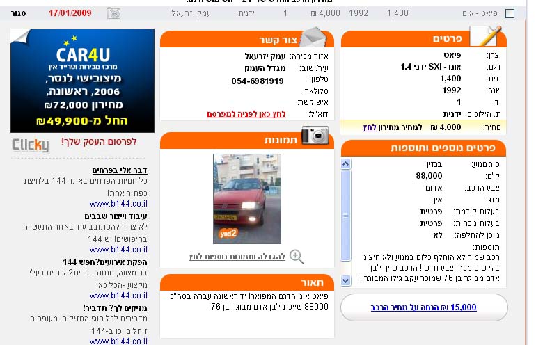 ראיתי בלוח יד 2. הרכב לא שלי! יצרן:פיאט דגם:אונו - SXI ידני 1.4 נפח:1,400 שנה:1992 יד:1 ת. הילוכים:ידנית מחיר:4,000 ₪ סוג מנוע:בנזין ק"מ:88,000 צבע הרכב:אדום מזגן:אין בעלות קודמת:פרטית בעלות נוכחית:פרטית מוכן להחלפה:לא תוספות: רכב שמור לא הוחלף כלום במנוע ולא חיצוני בלי שום מכה! צבע חדש!! הרכב שייך לבן אדם מבוגר בן 76 שמוכר עקב גילו המבוגר!! הכל אוריגינל ברכב עד הדברים הכי קטנים כמו טסות, ריפודים! מצב מכני מיותר לדבר!!! תאור: פיאט אונו הדגם המפואר! יד ראשונה עברה בסה"כ 88000 שייכת לבן אדם מבוגר בן 76! ![]() ![]() ![]() התמונות על שרת לוח יד 2- במידה והמודעה תרד אי יהיה אפשר לראות את התמונות. הרכב ייחטף מיידית- הרימו את הכפפה! נערך לאחרונה על ידי stio : 17-01-09 ב 18:44. |